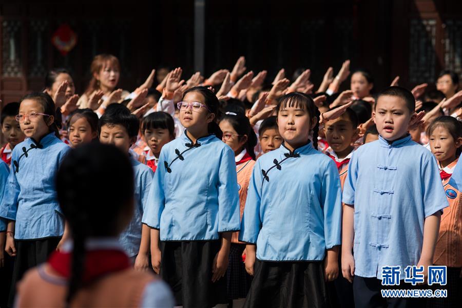9月27日,云南昆明长春小学学生在聂耳故居唱国歌。 当日,昆明市五华区在聂耳故居开展“同升国旗 同唱国歌”活动。 新华社记者 胡超 摄
