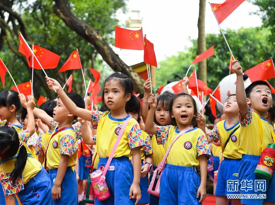 9月27日,广州小朋友挥舞国旗歌唱祖国。 当日,广州市番禺区北城珑翠幼儿园的小朋友们在长隆野生动物世界国宝朱鹮展区前歌唱《我和我的祖国》,用歌声表达对祖国的祝福。 新华社记者 刘大伟 摄