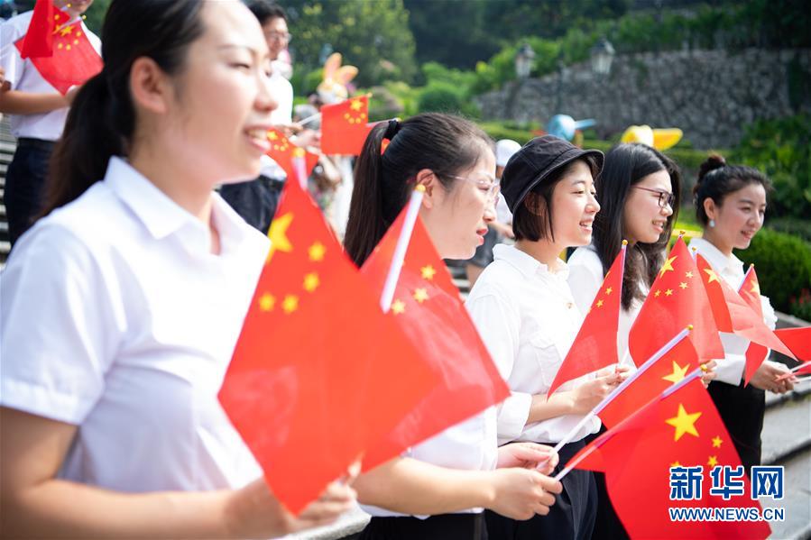 9月28日,中国铁建员工在澳门大三巴牌坊前参加“我和国旗合个影”活动,合唱《我和我的祖国》。新华社记者 张金加 摄