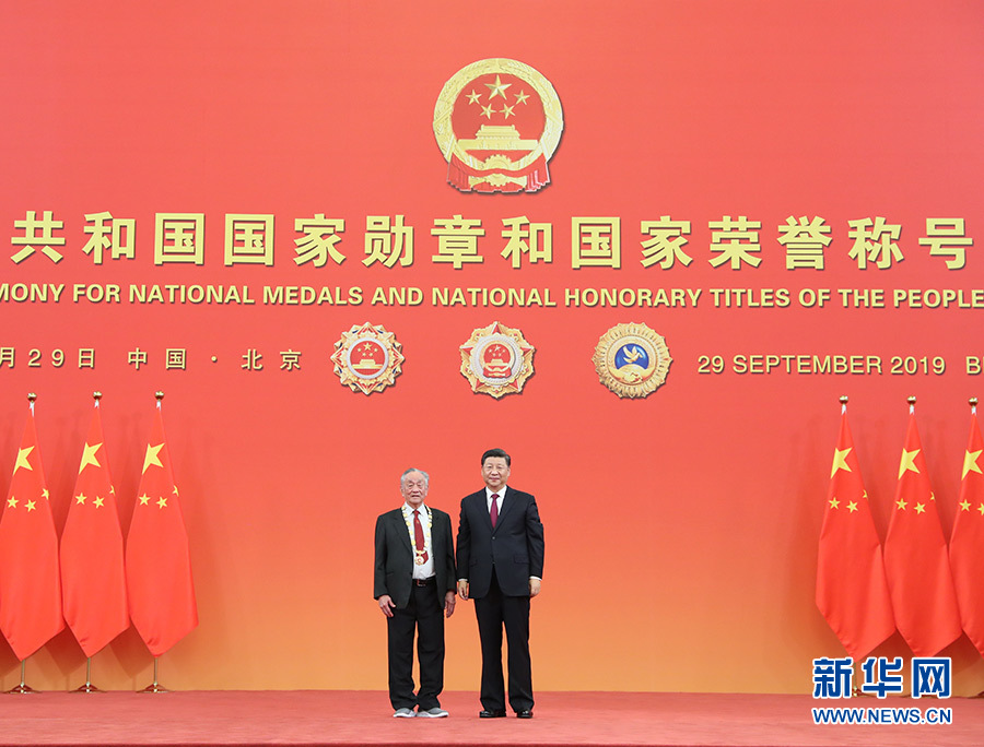 9月29日,中华人民共和国国家勋章和国家荣誉称号颁授仪式在北京人民大会堂金色大厅隆重举行。中共中央总书记、国家主席、中央军委主席习近平向“人民楷模”国家荣誉称号获得者王文教颁授奖章。 新华社记者 王晔 摄