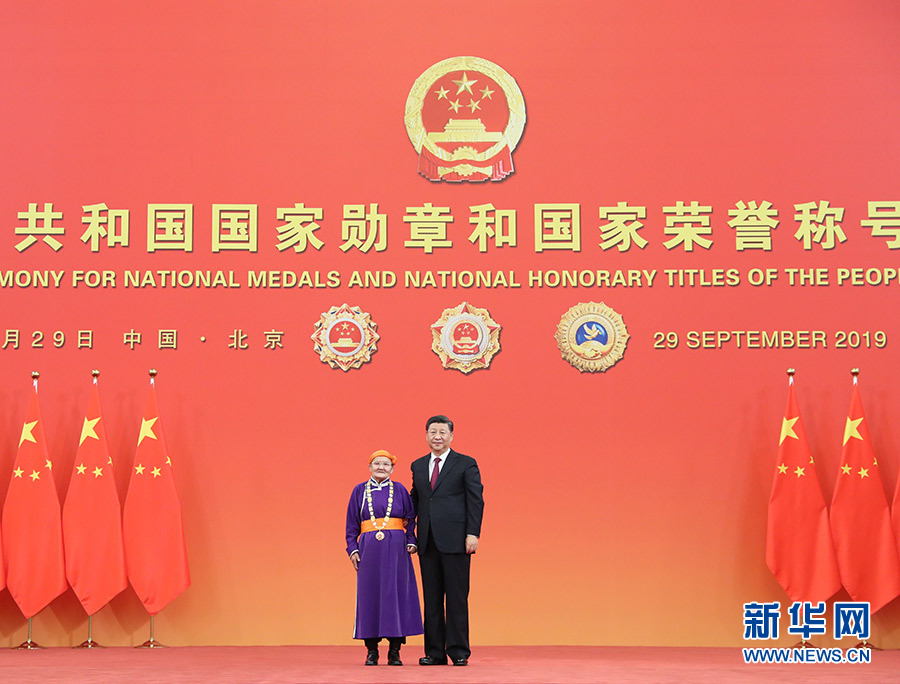 9月29日,中华人民共和国国家勋章和国家荣誉称号颁授仪式在北京人民大会堂金色大厅隆重举行。中共中央总书记、国家主席、中央军委主席习近平向“人民楷模”国家荣誉称号获得者都贵玛颁授奖章。 新华社记者 王晔 摄