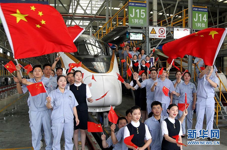 9月29日,铁路员工在高铁检修库内高唱爱国歌曲。新华社记者 陈飞 摄