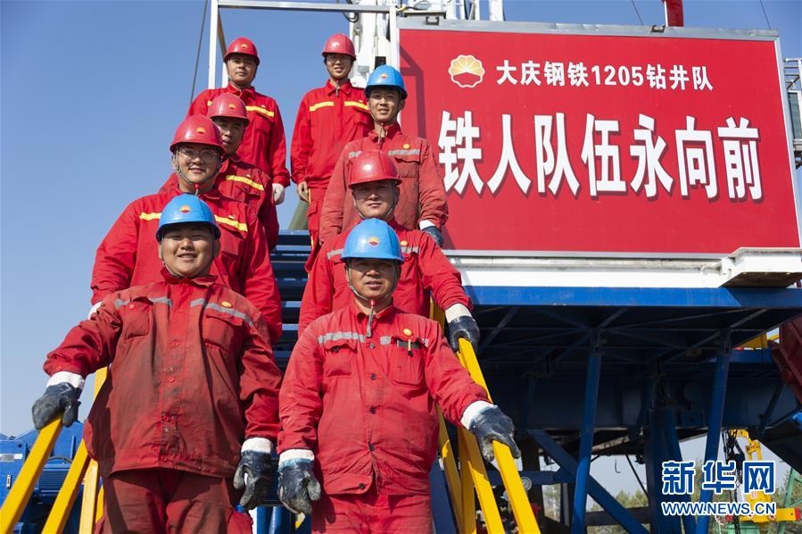 大庆油田1205钻井队的部分队员在钻井平台上合影(9月28日摄)。 新华社发(谢剑飞 摄)