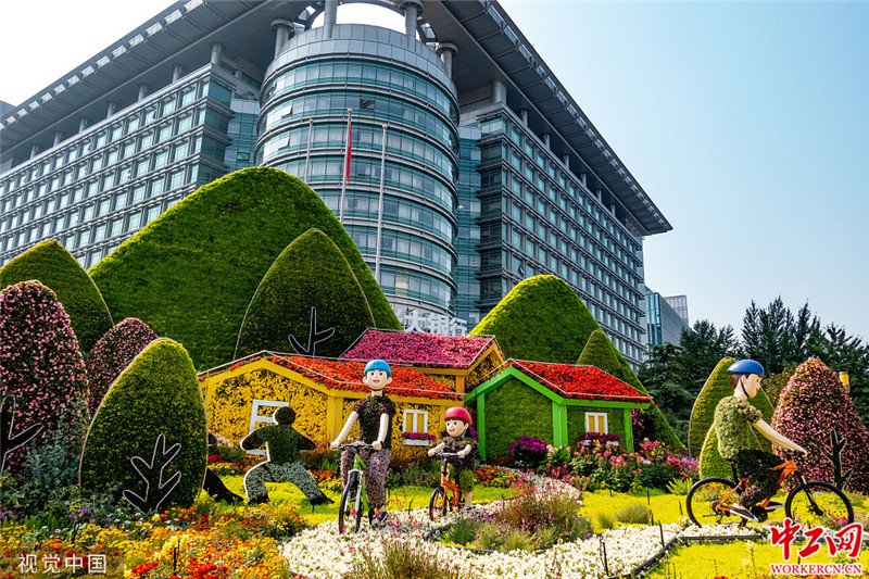 2019年9月29日,北京,长安街沿线花团锦簇。为庆祝中华人民共和国成立70周年,分别在建国门、东单、西单、复兴门摆放了以各种主题的盆花景观,吸引了众多市民来拍照留念。图片作者:曹琦/视觉中国