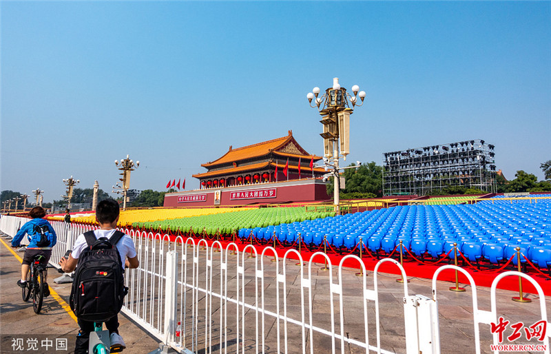 2019年9月29日,北京,长安街沿线花团锦簇。为庆祝中华人民共和国成立70周年,分别在建国门、东单、西单、复兴门摆放了以各种主题的盆花景观,吸引了众多市民来拍照留念。图片作者:曹琦/视觉中国