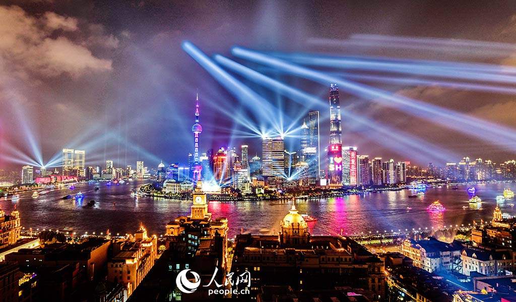 上海陆家嘴黄浦江灯光秀。黄伟国 摄