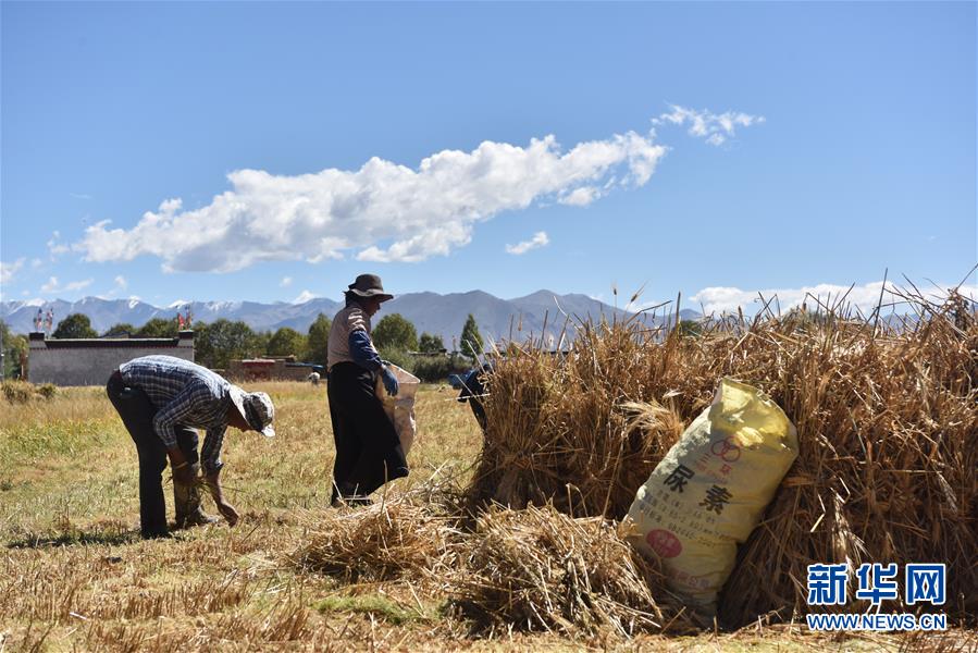 在西藏日喀则市江孜县紫金乡努堆村,村民在捡拾整理青稞(9月26日摄)。 新华社记者 周锦帅 摄