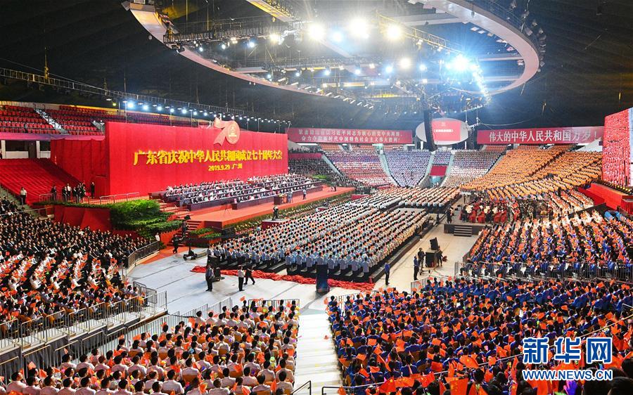 9月29日,广东省庆祝中华人民共和国成立70周年大会在广州体育馆隆重举行,大会邀请了为广东建设发展做出贡献的港澳爱国同胞代表。 新华社发(李细华摄)