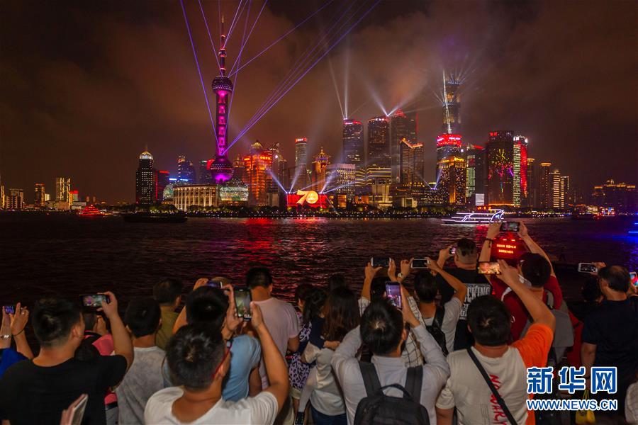 9月30日,人们在外滩拍摄灯光秀。国庆临近,华灯初上时,上海浦江两岸灯光璀璨夺目、交相辉映,使申城夜色更加美丽动人。新华社发(王翔 摄)