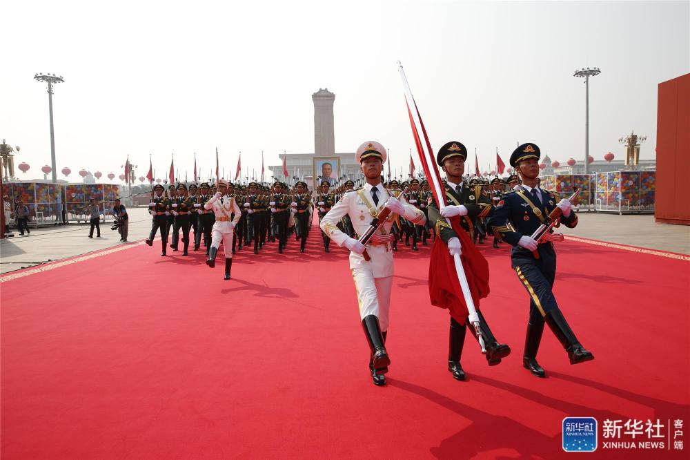 ↑这是国旗护卫队从人民英雄纪念碑基座出发,走向旗杆基座。新华社记者 费茂华 摄
