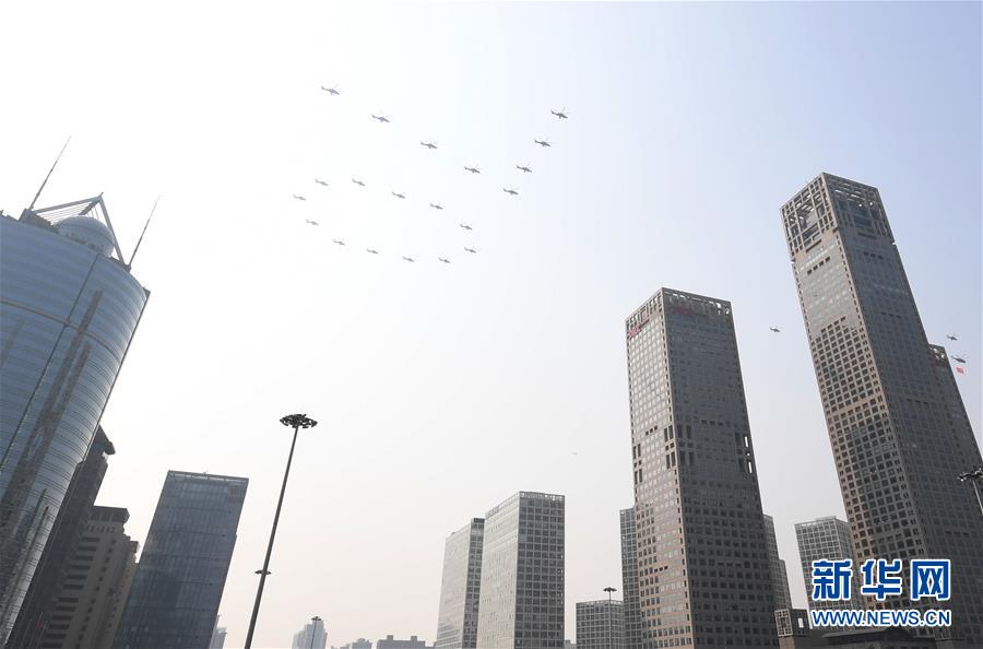 10月1日上午,庆祝中华人民共和国成立70周年大会在北京天安门广场隆重举行。 这是空中护旗梯队。 新华社记者 邓华 摄