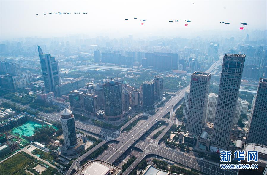 10月1日上午,庆祝中华人民共和国成立70周年大会在北京天安门广场隆重举行。这是空中护旗梯队。 新华社记者 肖艺九 摄