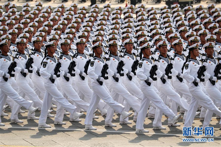 10月1日上午,庆祝中华人民共和国成立70周年大会在北京天安门广场隆重举行。这是海军方队接受检阅。 新华社记者 王晔 摄