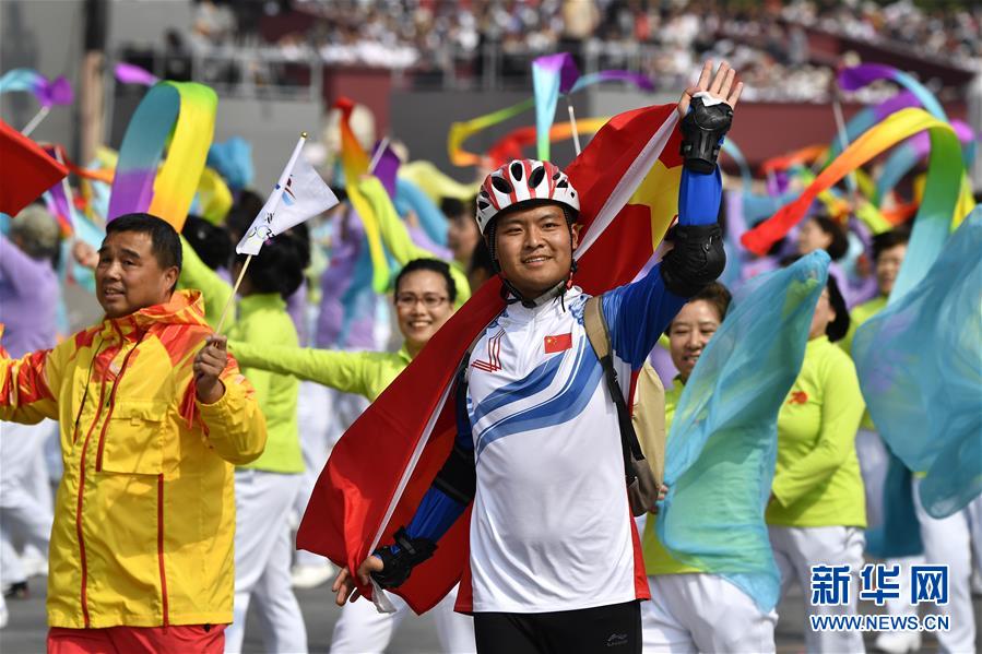 10月1日上午,庆祝中华人民共和国成立70周年大会在北京天安门广场隆重举行。 这是群众游行中的青春万岁情境式行进。 新华社记者 陈益宸 摄