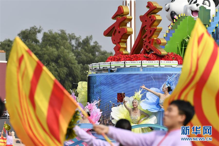 10月1日上午,庆祝中华人民共和国成立70周年大会在北京天安门广场隆重举行。 这是群众游行中的“魅力重庆”彩车。 新华社记者 刘潺 摄