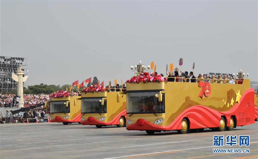 10月1日上午,庆祝中华人民共和国成立70周年大会在北京天安门广场隆重举行。 这是群众游行中的“江苏智造”彩车。 新华社记者 刘潺 摄