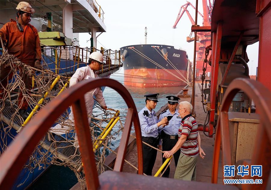10月3日,河北黄骅出入境边防检查站的民警在黄骅港综合港区码头检查外轮船员的登轮证件。 国庆假期,许多劳动者依旧奋战在一线,坚守岗位。 新华社记者 杨世尧 摄