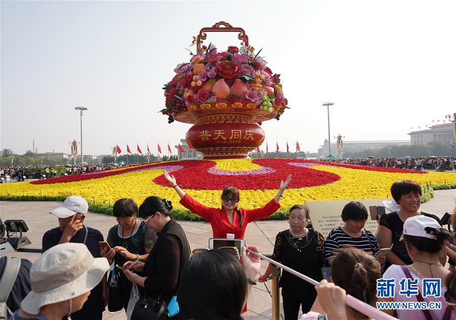 10月3日,游客与天安门广场中心的巨型花篮合影。 当日是国庆假期第三天,众多游客来到北京天安门广场参观游览。 新华社记者 鞠焕宗 摄
