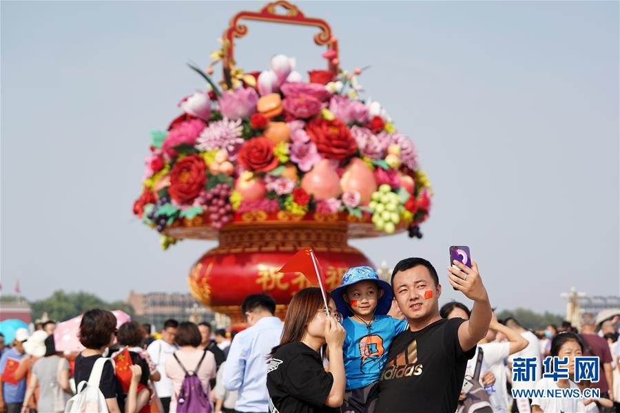 10月3日,游客与天安门广场中心的巨型花篮合影。 当日是国庆假期第三天,众多游客来到北京天安门广场参观游览。 新华社记者 鞠焕宗 摄