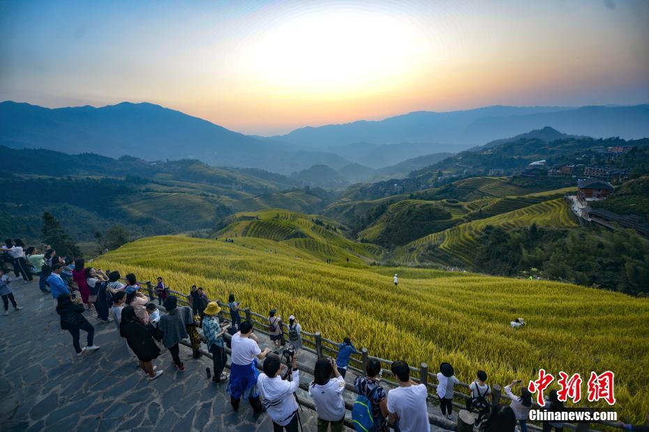 10月3日,广西桂林市龙胜各族自治县龙脊梯田。“十一”国庆假期,正值广西桂林市龙胜各族自治县龙脊梯田稻谷成熟时节,吸引众多游客旅游观光。中新社发潘志祥 摄