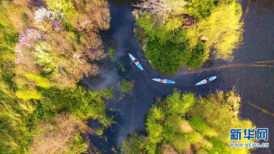 滇池湖滨湿地之一——永昌湿地,3位“市民河长”正划着皮划艇巡河。自2009年以来,昆明市已招募4届“市民河长”,成为滇池保护中重要的民间力量。(新华网 赵普凡/摄)
