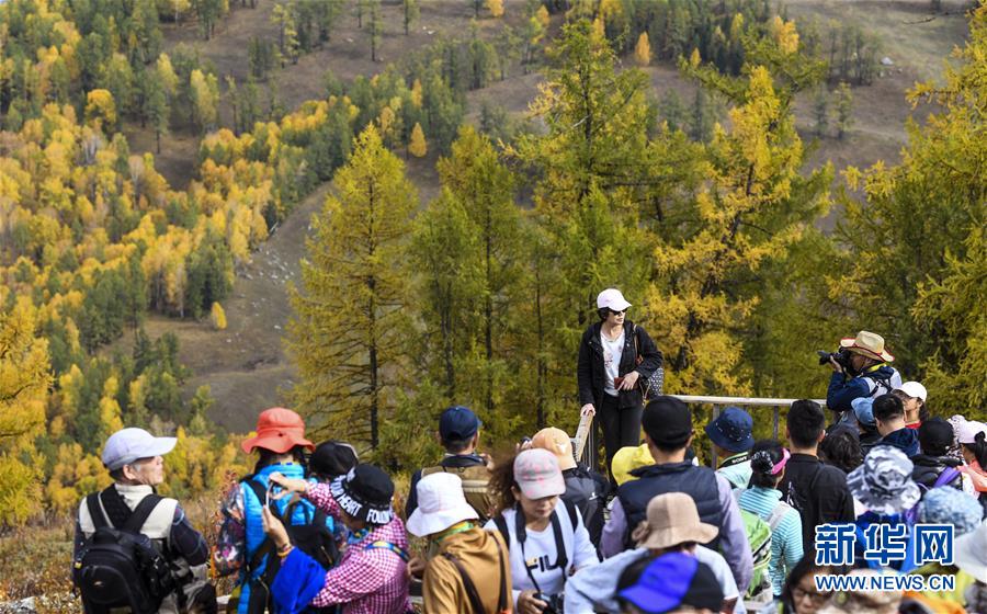 游客在新疆喀纳斯景区观光留影(9月23日摄)。 截至10月3日,著名的新疆喀纳斯景区年内已接待游客超过1000万人次。 新华社记者 王菲 摄