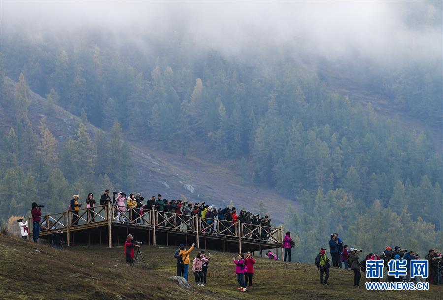 游客在新疆喀纳斯景区观光拍照(9月24日摄)。 截至10月3日,著名的新疆喀纳斯景区年内已接待游客超过1000万人次。 新华社记者 王菲 摄