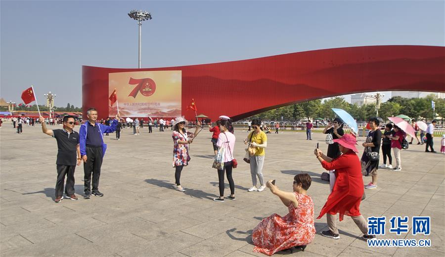 游人在天安门广场参观留影(9月27日摄)。新华社记者李欣摄