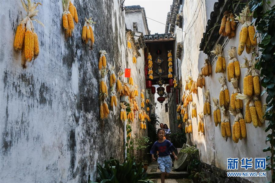 10月5日,游客在新叶古村的巷子内观赏美景。 新华社记者 徐昱 摄
