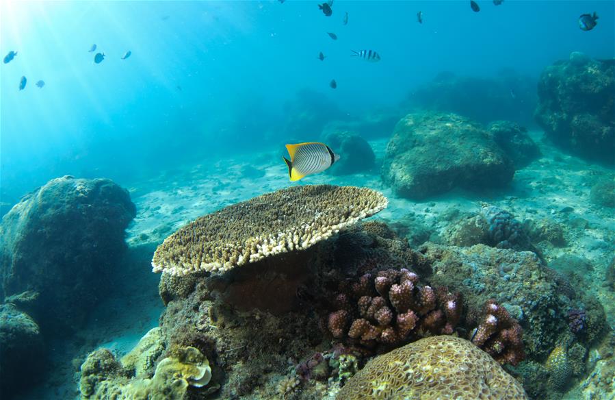 10月5日,在分界洲岛海域,鱼儿在珊瑚附近游动觅食。 新华社记者 杨冠宇 摄