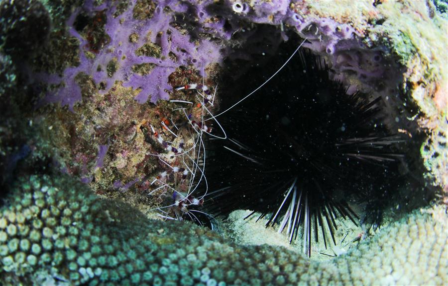10月5日在分界洲岛海域拍摄的美人虾和海胆。 新华社记者 杨冠宇 摄