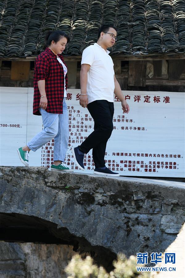 潘荣冬和谭丽飞在铜仁市万山区敖寨乡瓮背村走访贫困户途中(9月24日摄)。 新华社记者 杨文斌 摄