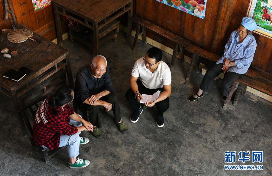 潘荣冬(左三)和谭丽飞(左一)在铜仁市万山区敖寨乡瓮背村走访帮扶对象(9月24日摄)。 新华社记者 杨文斌 摄