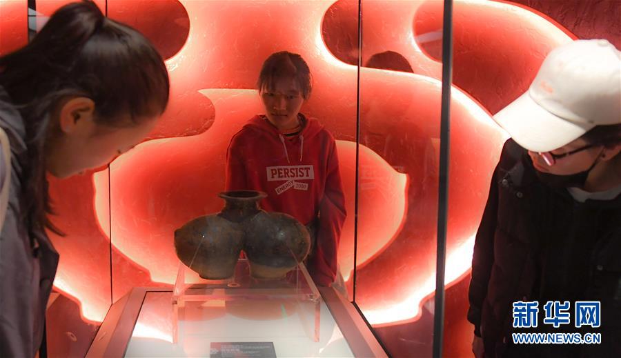 10月5日,参观者观看昌都卡若遗址出土的“双体同源”陶罐展品。 国庆期间,拉萨布达拉宫珍宝馆《历史的见证》文物展吸引众多游客前来参观。此次展览于9月26日开展,从拉萨布达拉宫、西藏博物馆、罗布林卡、西藏自治区文物保护研究所等单位遴选了西藏不同历史时期最具代表性的七件(组)国宝级文物及两百余件珍贵文物集中展出。 新华社记者 晋美多吉 摄