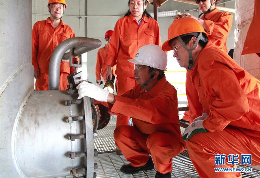 陈俊武院士(前左)在内蒙古包头甲醇制烯烃(DMTO)现场检查作业(2010年6月13日摄)。 新华社发