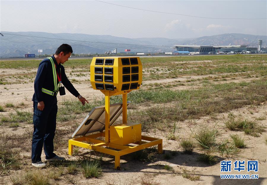 张欢在西宁曹家堡国际机场检查太阳能声波驱鸟器(10月5日摄)。新华社发(张子琪 摄)