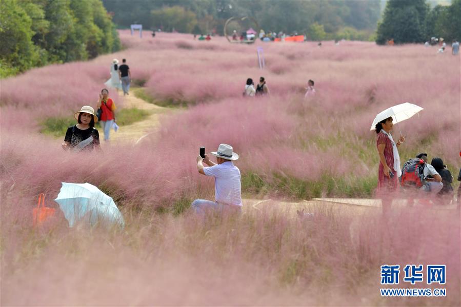 10月6日,在江西省南昌市南昌县凤凰沟景区,游客在粉黛乱子草丛中拍照游玩。 当日是国庆长假的第六天,江西省南昌市南昌县凤凰沟景区迎来大批游客,景区内粉黛乱子草呈现出粉色“云雾海洋”的壮观景色,观赏效果极佳。 新华社记者 彭昭之 摄