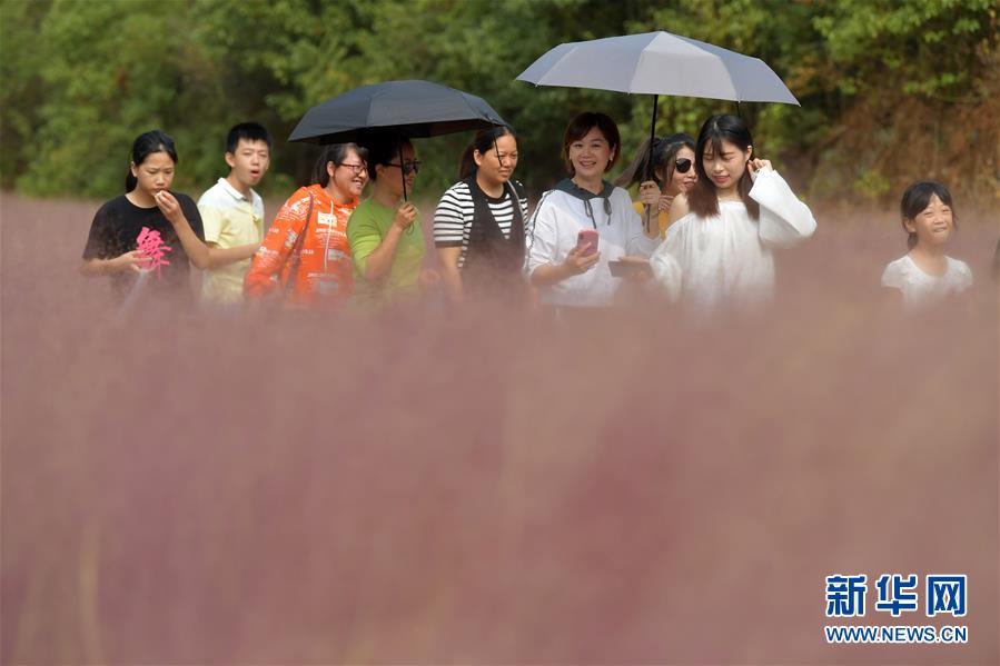 10月6日,在江西省南昌市南昌县凤凰沟景区,游客在粉黛乱子草丛中游玩。 当日是国庆长假的第六天,江西省南昌市南昌县凤凰沟景区迎来大批游客,景区内粉黛乱子草呈现出粉色“云雾海洋”的壮观景色,观赏效果极佳。 新华社记者 彭昭之 摄