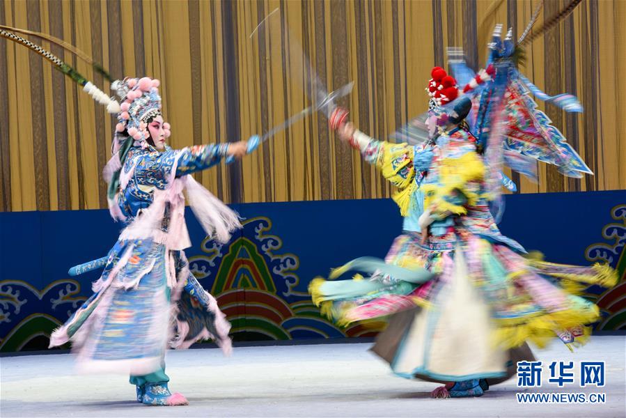 10月6日,乌鲁木齐市京剧团演员在京剧《樊江关》的表演中。新华社记者 丁磊 摄