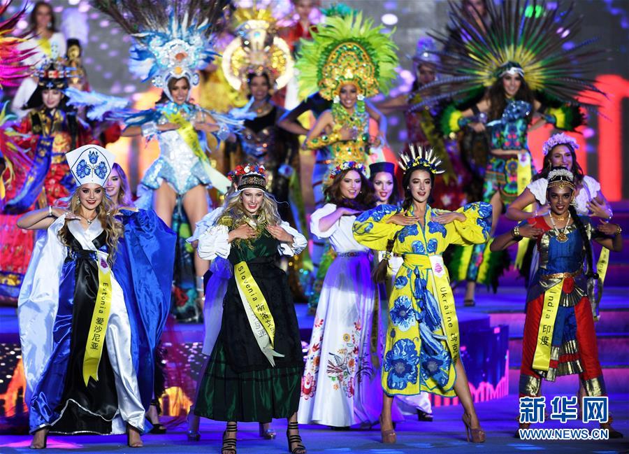 10月6日,选手在比赛中亮相。 10月6日晚,2019世界旅游小姐全球总决赛颁奖盛典在山东青岛举行。来自67个国家和地区的佳丽在民族服装、泳装、晚装以及才艺展示环节各展风采,最终来自墨西哥和加拿大的两名选手分获冠亚军,中国选手谭若依获得季军。 新华社记者 李紫恒 摄