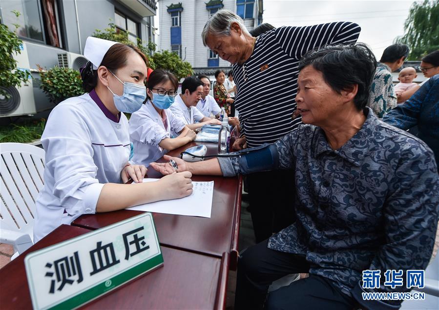 10月7日,医务人员在河西埭村的孝心大会现场为老人免费体检。该村当日有300多名70岁以上的老人在村文化礼堂内参加孝心大会。 当日,浙江省杭州市余杭区塘栖镇的多个乡村举办重阳节孝心大会活动,传承尊老敬老的优良美德,欢度重阳节。 新华社记者 徐昱 摄