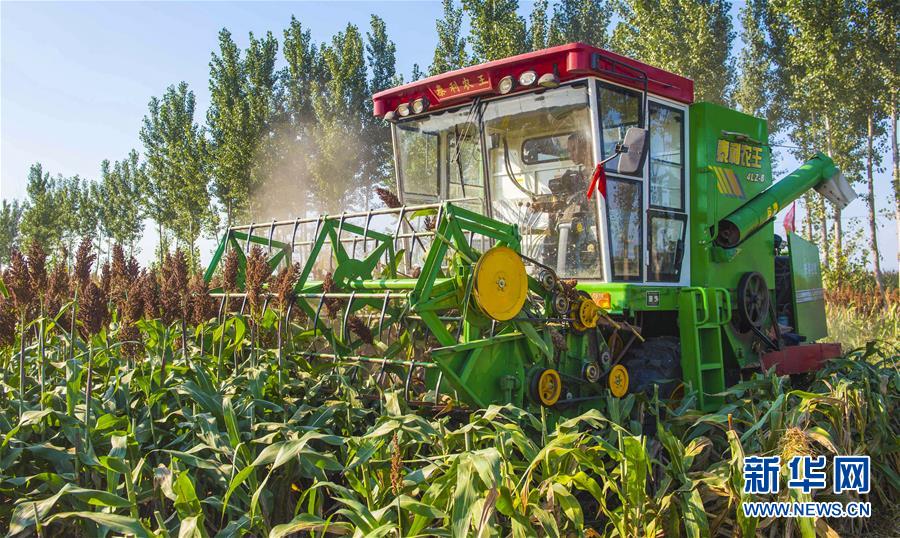 10月7日,在枣强县肖张镇西赵庄村,村民使用收割机收割高粱。 新华社记者 李晓果 摄