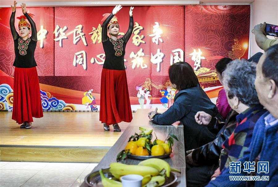 10月7日,乌鲁木齐市水磨沟区新民路片区管委会鸿升社区工作人员为老人表演节目。 新华社记者王菲摄