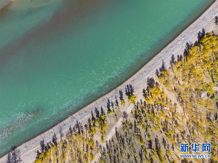 拉萨河南岸的杨树林(10月7日无人机拍摄)。 金秋时节,拉萨河两岸杨树披上“金装”。 新华社发(孙非摄)