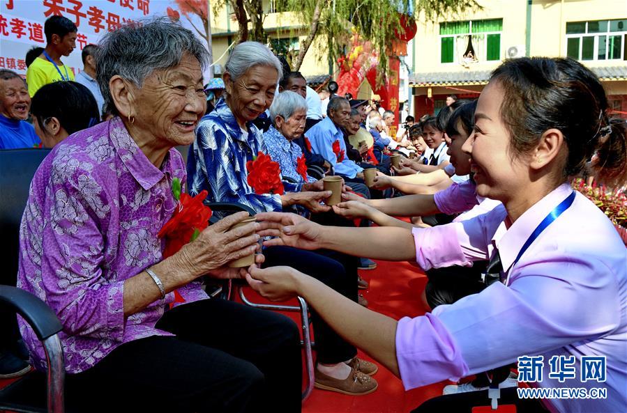 10月7日,晚辈在敬老节活动现场为老人敬茶。 新华社记者 张国俊 摄