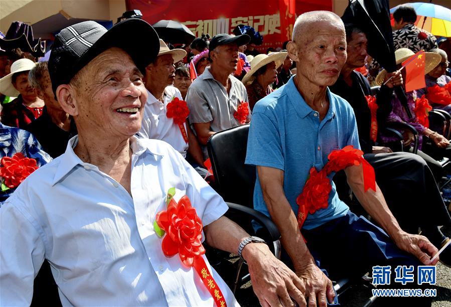 10月7日,武夷山市兴田镇西郊村的83岁老人曹祖康(前左一)在敬老节上露出笑容。 新华社记者 张国俊 摄