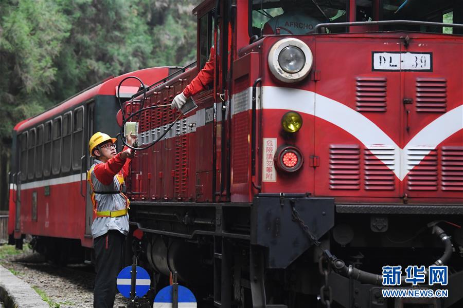 10月7日,工作人员在阿里山森林小火车行经路线旁作业。新华社记者 陈斌 摄