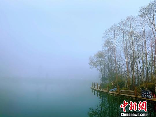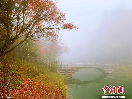 秋日的甘肃陇南市宕昌县官鹅沟景区内,山川湖泊均被朦胧的雾气笼罩。 赵鹏 摄