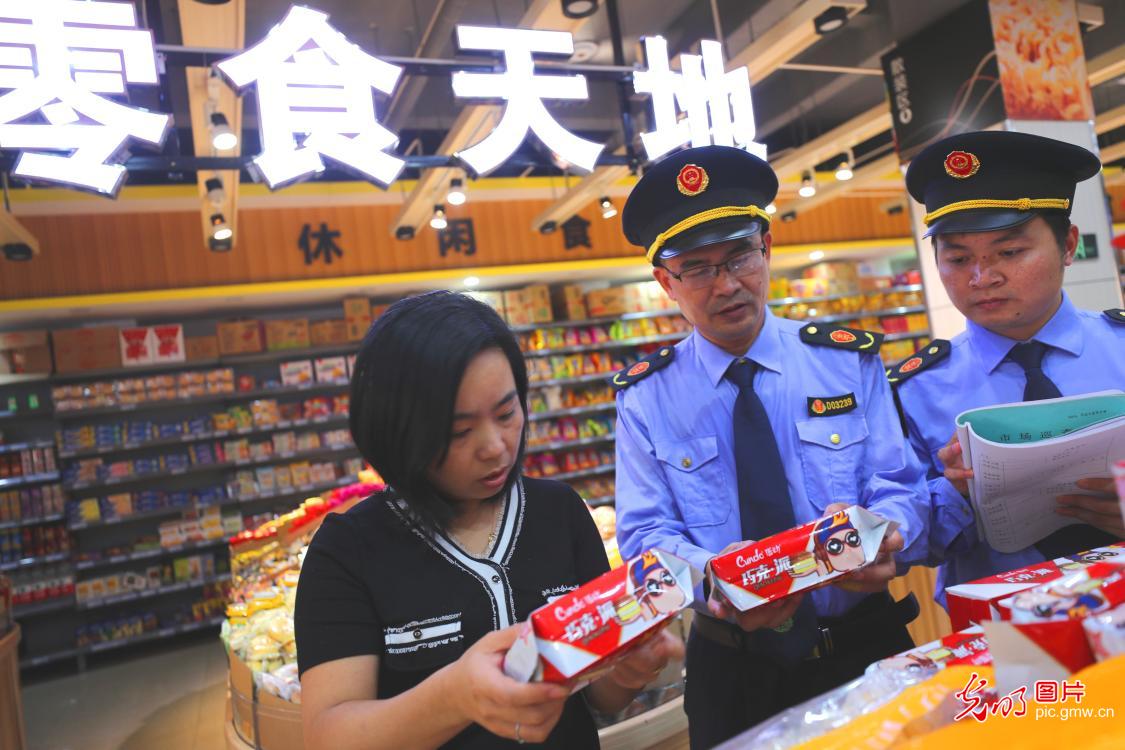 2019年9月29日,江西省吉安市泰和县市场监督管理局沙村分局执法人员在检查监管市场商品质量。 国庆临近,泰和县强化节日市场监管,严把商品质量关,加强食品生产、流通、餐饮等环节的检测工作,保障节日期间物资供应和食品安全。(邓和平摄/光明图片)