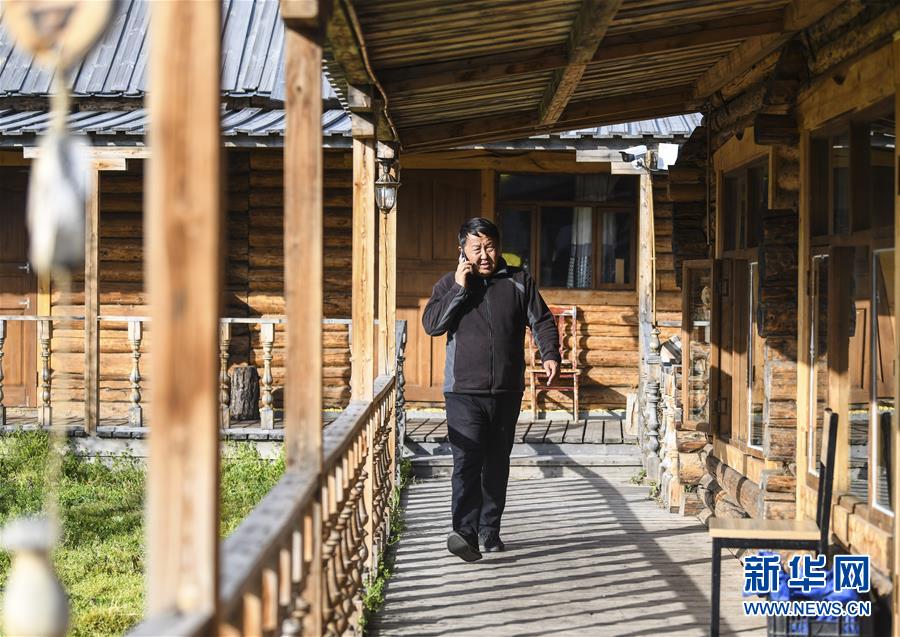 叶儿克巴图走在自家民宿的廊道上接听游客订房电话(9月25日摄)。新华社记者 王菲 摄
